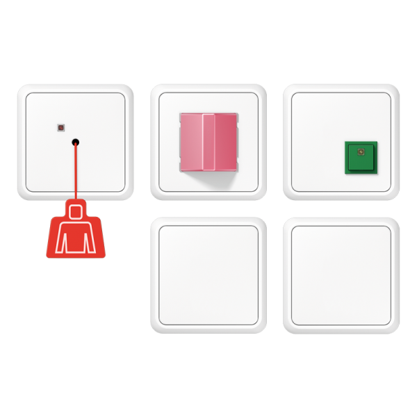 The service unit, service terminal and the call button are separately available. The service unit can be installed in addition to the components of the emergency set e.g. in a staff room or lobby. A green button indicates presence while a yellow button suppresses the acoustic emergency signal for 20 seconds. The call button has an additional control for triggering an emergency call.