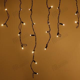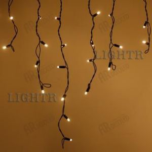 Светодиодная гирлянда "Бахрома" серии PRO. Размер 5600x900 (длина 5600 мм, максимальная высота 900 мм). Цвет светодиодов ТЁПЛЫЙ БЕЛЫЙ (3000К). Эффект мерцания (Белый цвет 6000К). 180-200 вспышек в минуту. Материал провода - чёрный РЕЗИНОВЫЙ (каучук). Диаметр провода 3.3 мм. 48 нитей длиной от 200 до 900 мм, ниспадающих вниз. Количество светодиодов 240 шт. Размер светодиодов 5 мм с защитным колпачком и вогнутой внутрь линзой. Напряжение питания DC 230V, потребляемая мощность 15W. Степень защиты от воздейст